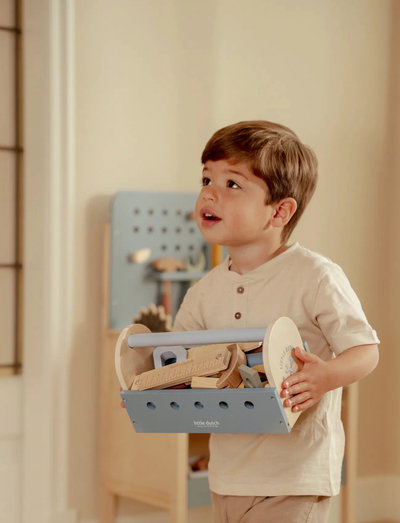 Alt, hvad en lille tømrer har brug for! Denne værktøjskasse i træ indeholder en hammer, skruetrækker og skruenøgle - perfekt til at bygge de mest vidunderlige kreationer. Men det er ikke alt - kassens sider kan også bruges som slagbænk! På den måde kan de små hamre og skrue, mens de på en legende måde udvikler deres motorik og kreativitet. Er du klar til at gå i gang?