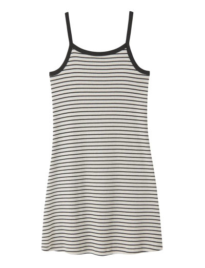 Denne ærmeløse kjole er fremstillet i en elastisk ribstrik med et stribet mønster, perfekt til varmt vejr. Den slanke pasform og U-halsen skaber et tidløst look, ideelt til solrige dage og lyse nætter.