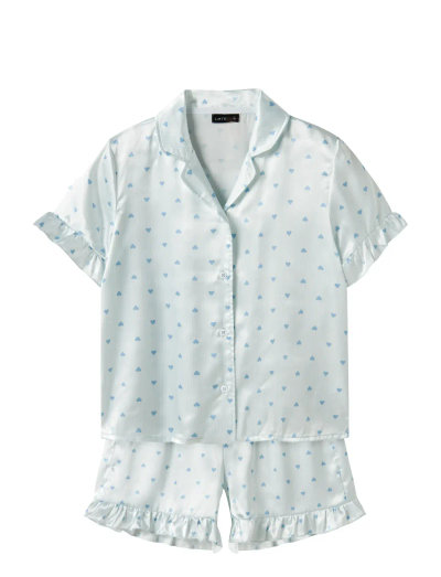 Drøm sødt i dette bløde pyjamassæt. Dette sæt består af to dele, en skjorte med knapper, korte ærmer og flæsekanter, samt matchende shorts med flæsekanter forneden. Det gennemgående print giver dette behagelige nattøj et legende udtryk.
