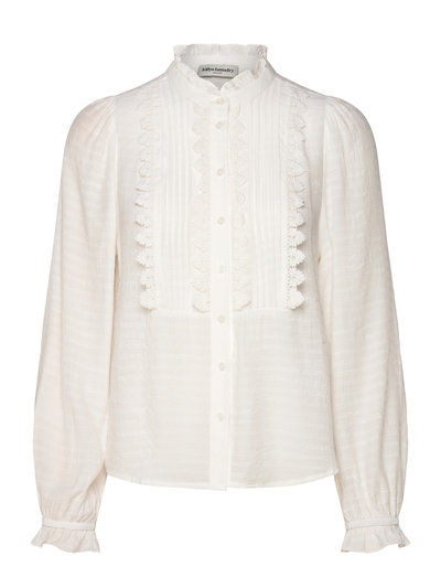 Denne elegante bluse har en høj halsudskæring med en fin flæse og en knaplukning. De lange ærmer har en flæset manchet, der tilføjer et strejf af femininitet. Blusen er lavet af et blødt og behageligt stof, der gør den perfekt til enhver lejlighed.