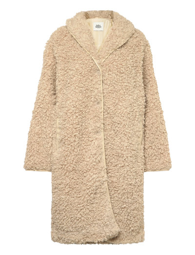 Denne jakke er fremstillet af blødt teddy-stof og er en hyggelig og stilfuld løsning til køligere dage. Designet har en afrundet sjalskrave og knaplukning foran, fremhævet af tone-i-tone imiteret læderkant langs kanterne og i nakken. Den oversized pasform sikrer varme og komfort, mens praktiske lommer tilføjer funktionalitet.