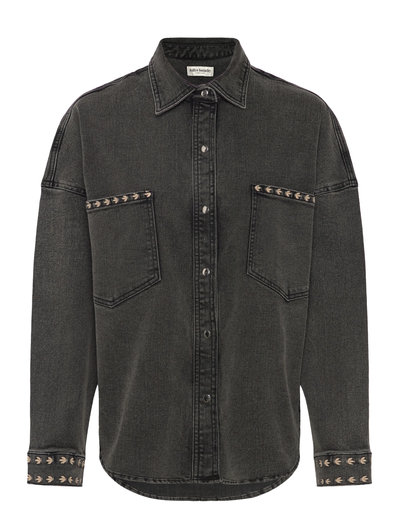 Denne oversized skjorte er fremstillet i kraftig, vasket sort denim og har et cool og edgy udtryk. Metalknapper og store brystlommer understreger dens anvendelighed, mens broderede motiver pryder manchetter, skuldre, lommer og krave, hvilket tilføjer et feminint touch. Brug den lukket som en skjorte eller åben som en let jakke for alsidig styling.