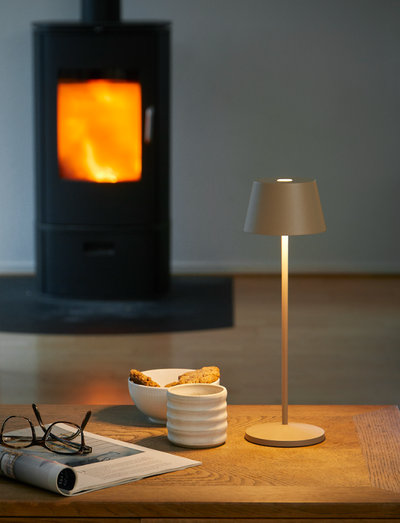Modi batteribordlampen i hvid har et elegant design med sin klassiske skærm, der sørger for at udsende lyset direkte nedadrettet. På skærmen sidder en berøringsdæmper, der gør det let at justerer lyset