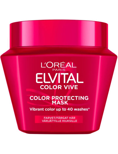 Elvital Color-Vive beskyttende hårmaske med næringsgivende koncentrat, UVA- og UVB-filter samt Color-Seal Elixir™ til farvet hår og hår med striber plejer håret intenst og beskytter hårfarvens glans. Lad masken virke i 2-3 minutter, før den skylles ud.