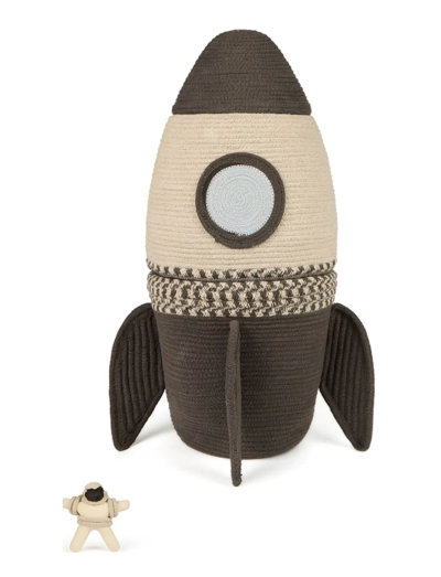 Buckle up, because we're about to launch into outer space! The Basket Giant Rocket is not just one basket but three separate baskets that stack to form a rocket ship ready for takeoff. Each layer is carefully handcrafted with braided cotton cord made from cotton and recycled PET bottle fibers, making it more resistant and featuring details in dark grey, natural, and light blue.