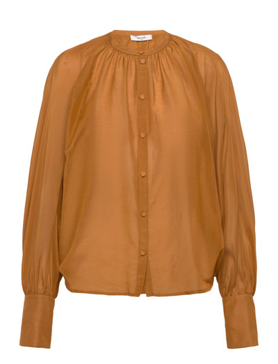 Denne lette bluse er fremstillet i en blanding af bomuld og silke og har en rund halsudskæring med fine rynker. De voluminøse ærmer med pufdetaljer forneden og høje manchetter med stofbetrukne knapper tilføjer et strejf af elegance, hvilket gør den velegnet til både hverdagsbrug og særlige lejligheder.