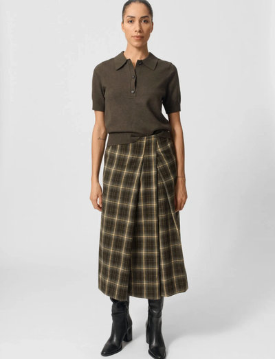 Denne nederdel har et subtilt slå-om-design, der giver en sofistikeret silhuet. Det ternede mønster tilføjer et tidløst præg, hvilket gør den til en alsidig tilføjelse til enhver garderobe.