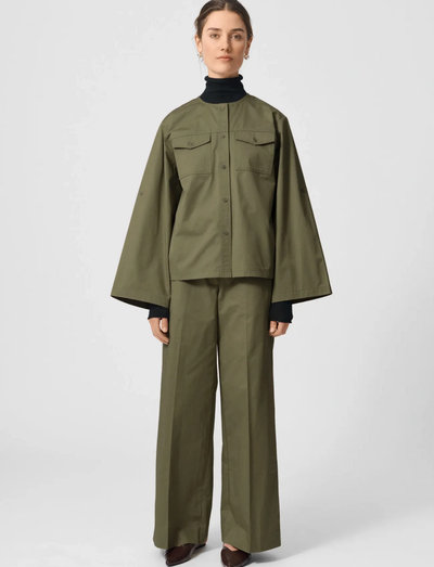 Disse bukser med brede ben har en moderne silhuet med høj talje og en ren, skræddersyet finish. Designet har klassiske bæltestropper og en sikker knaplukning, hvilket gør dem til en alsidig tilføjelse til enhver garderobe.