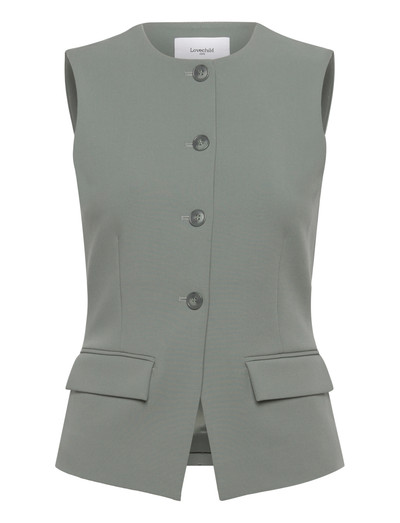 Denne elegante vest har en skræddersyet silhuet med sit slanke design. Med knaplukning foran, paspolerede lommer med klap i siden og en diskret slids midt bagpå, er det en alsidig beklædningsgenstand.