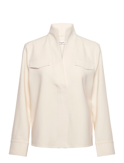 Denne bluse har en moderne V-hals med en opretstående krave og er en alsidig tilføjelse til enhver garderobe. Designet omfatter en manchet med knap, der tilføjer et klassisk touch. Den er skabt til både komfort og stil og er velegnet til både hverdagsbrug og særlige lejligheder. Den fleksible pasform sikrer bevægelsesfrihed.