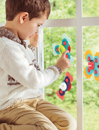 Sjove baby-spinnere. Disse spinnere er superenkle at bruge. Bare tryk på spinneren, så drejer den rundt og rundt takket være kuglelejet indeni. Babyspinnerne er små, så de er lige så nemme at stoppe igen. Bladene er bløde og fleksible, så barnet ikke kommer til skade. Spinnerne kan bruges på alle glatte, ikke-porøse overflader ved hjælp af den tykke plastiksugekop. Kan f.eks. bruges på barnets høje stol, i badet, på vinduet eller på kommoden/skrivebordet. Men er også perfekt at bruge på restauranten, på bilvinduet eller på vinduet i flyet. Udvikler barnets fingerfærdighed og synsstyrke samt stimulerer dets koncentration og koordination. Alder: +10 måneder. Emballagestørrelse: 18 x 20 x 5 cm. Materiale: ABS, TPE og PVC