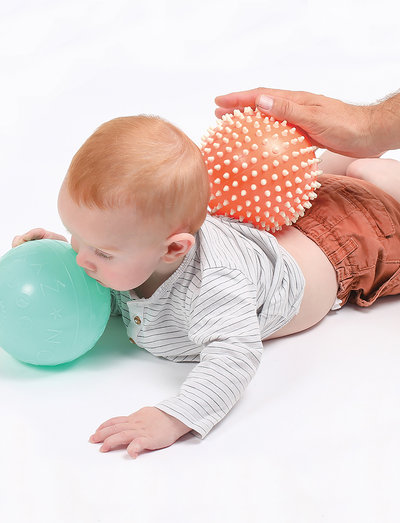 Sansebolde er perfekte til massage og leg. Sansebolde er sjove at lege med og hjælper med at udvikle barnets følesans og smidighed. Sansebolden med de tofarvede knopper giver en blid massage og er ideel at bruge til afslappende stunder med barnet. Leg med bolde er også med til at styrke barnets motorik og motivere det til at bevæge sig. Alder: +6 måneder. Produktets størrelse: Ø 13 cm. Materiale: 100% PVC