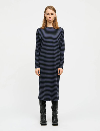 Denne langærmede kjole har en strømlinet silhuet og er designet til ubesværet stil. Det bløde stof falder smukt, hvilket gør den til et behageligt valg til hverdagsbrug. Det enkle design gør den alsidig til forskellige lejligheder.