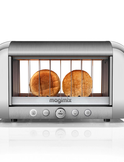 Verdens første gennemsigtige toaster, der gør det nemt at holde øje med brødets ristning. Professionel Magimix toaster, der rister, optør og varmer alle typer af brød bag isolerende dobbeltglas. Enkel at betjene med én knap pr. funktion og med plads til ekstra tykke skiver.
