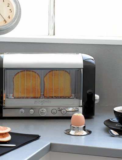 Verdens første gennemsigtige toaster, der gør det nemt at holde øje med brødets ristning. Professionel Magimix toaster, der rister, optør og varmer alle typer af brød bag isolerende dobbeltglas. Enkel at betjene med én knap pr. funktion og med plads til ekstra tykke skiver.