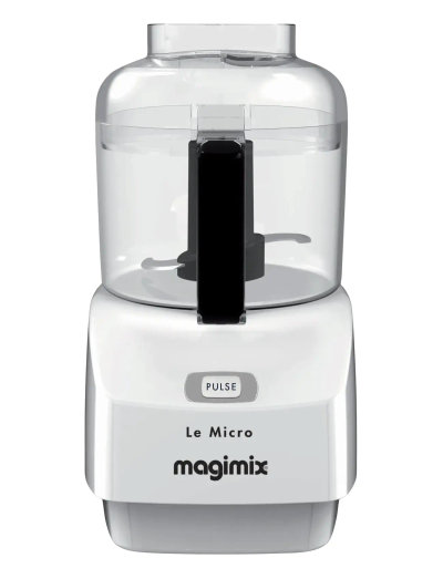 Magimix minihakker er effektiv, stilfuld og støjsvag. Den optager kun lidt plads på køkkenbordet og har et så flot design, at du gerne lader den stå fremme. Betjeningen er enkel. Låget har to åbninger til påfyldning af henholdsvis flydende og faste ingredienser, sættes let på og tages lige så nemt af. På fronten findes en enkelt knap til at aktivere både pulse-funktion og kontinuerlig kørsel, når knappen holdes nede.