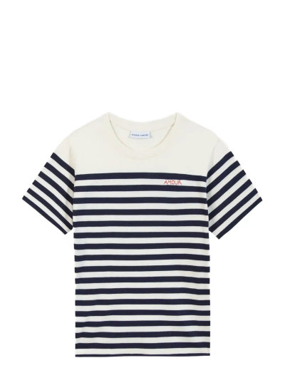 Denne T-shirt har klassiske striber og giver et tidløst look. Den er fremstillet med en lige pasform, en ribstrikket rund hals og forstærkede sømme for øget holdbarhed.