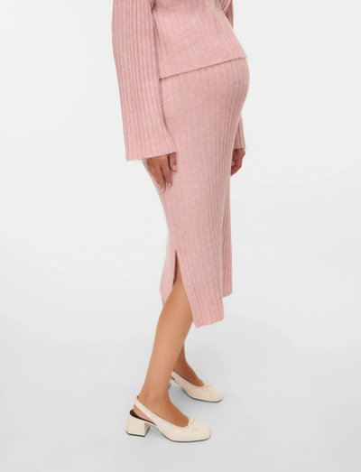 Denne strikkede nederdel giver en behagelig og stilfuld pasform under hele din graviditet. Designet med en høj talje og midi-længde, giver den en flatterende silhuet. Den elastiske talje og bump band sikrer ekstra støtte og komfort, efterhånden som din mave vokser, hvilket gør den perfekt til enhver lejlighed.