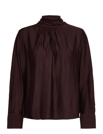 Denne langærmede bluse er fremstillet i et let tekstureret stof og har et lige design og en høj halsudskæring. Halsen er udsmykket med et tørklæde, og ærmerne er afsluttet med manchetter med knapper.