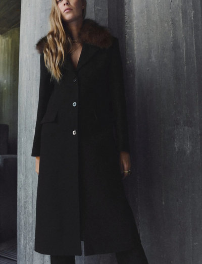 Denne lange frakke i et lige design er fremstillet af en uldblanding og har en aftagelig krave med pels-effekt, der giver mulighed for alsidig styling. Den har også en reverskrave med V-udskæring, lange ærmer med knapmanchetter, to lommer med klap foran, knaplukning foran og fuld indvendig foring.