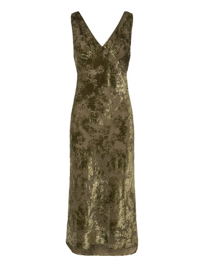 Denne lange kjole er fremstillet i jacquardvævet stof og har en elegant A-linje silhuet. Den er designet med brede stropper og en flatterende V-udskæring, og har en skjult lynlåslukning og fuld foring. Den er en del af en kollektion til særlige lejligheder og er perfekt til bryllupper og fester.