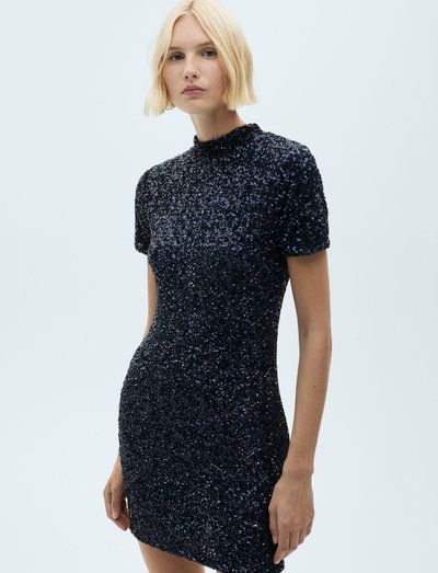Denne korte sequin-kjole er et stilfuldt og elegant valg til enhver lejlighed. Kjolen har en figursyet silhuet og en rund halsudskæring. Den er perfekt til en aften ude eller en speciel begivenhed.