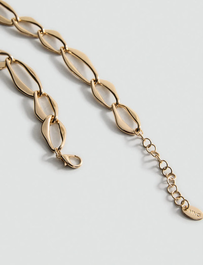 Denne halskæde har et fladt design med sammenhængende led. Den lukkes med lynlås og karabinhage.