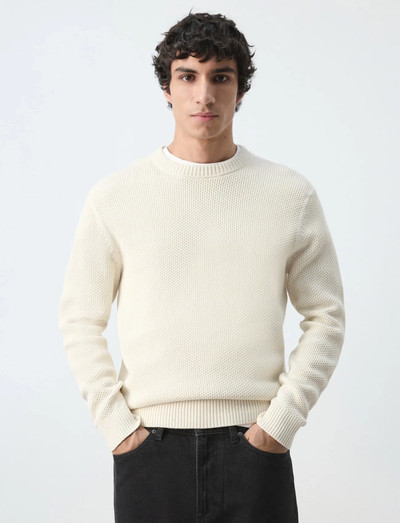 Denne strik er fremstillet af en bomuldsblanding og har en mellemvægt, hvilket giver en behagelig fornemmelse. Det lige design og den ubeskårne kant skaber en ren, moderne silhuet, der suppleres af en klassisk rund hals og subtile mikrostrukturdetaljer.