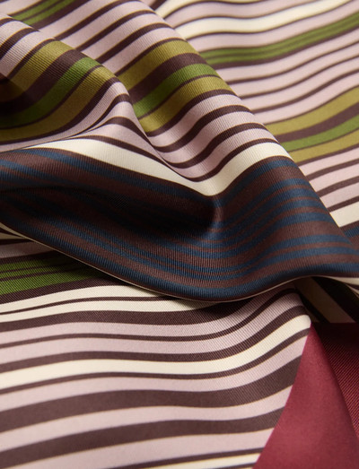 Dette tørklæde er fremstillet af glat satin og har en klassisk firkantet form. Det iøjnefaldende stribede design tilføjer et strejf af visuel interesse til ethvert outfit.