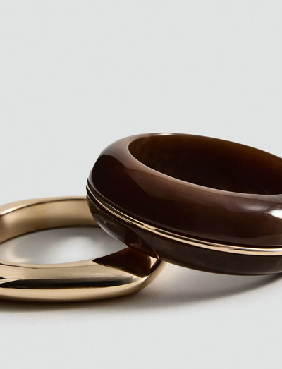 Dette sæt består af to armringe med et solidt, struktureret design. De kombinerede former giver et moderne, minimalistisk udtryk, der er perfekt til at stable eller bære alene.
