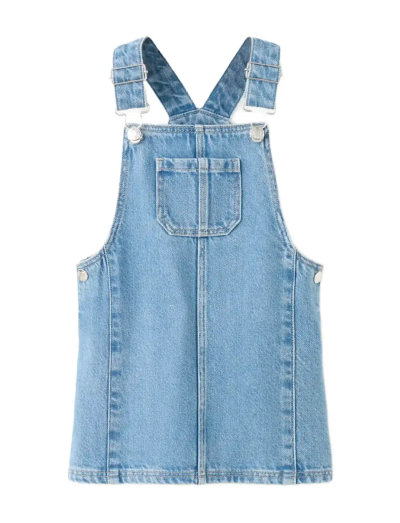 Denne denim-forklædekjole er fremstillet af 100% bomuld og har justerbare stropper, der sikrer en behagelig pasform. Designet har sømdetaljer og en praktisk sideknaplukning, hvilket giver en blanding af klassisk stil og hverdagsbrug.