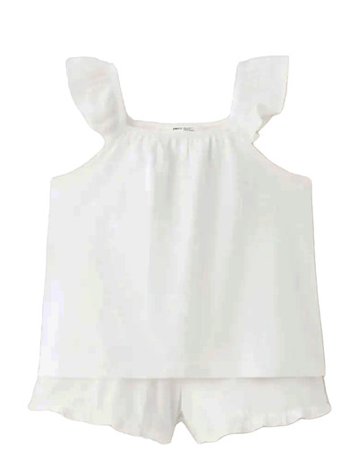 Dette charmerende pyjamassæt er fremstillet af ren bomuld og sikrer en blød og åndbar følelse hele natten. Sættet indeholder en kortærmet T-shirt og matchende shorts, begge designet med et lige snit for en behagelig pasform. Flæsekanter på stropperne og forneden tilføjer et delikat touch, mens den elastiske talje i shortsene giver nem komfort.