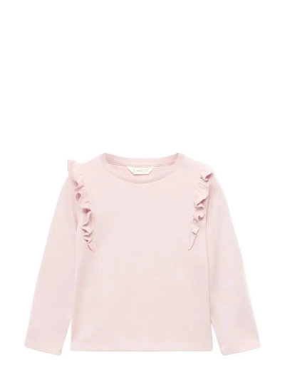Denne langærmede t-shirt er fremstillet af ren bomuld og har charmerende flæser på skuldrene samt en klassisk rund hals. Det lige design sikrer en behagelig pasform, hvilket gør den til en alsidig tilføjelse til enhver garderobe.