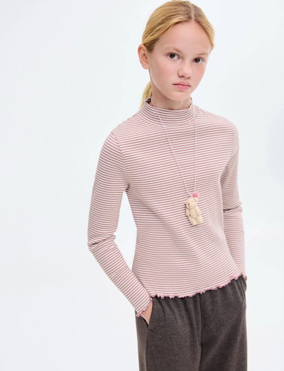 Denne langærmede T-shirt har en legesyg, bølget kant og en behagelig pasform med stretch. Den høje halsudskæring og det klassiske stribede design gør den til en alsidig tilføjelse til enhver garderobe. Fremstillet af blødt bomuldsstof, der er behageligt at have på hele dagen.