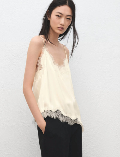 Denne elegante top er fremstillet af glat satin og har fine blondekanter og en flatterende V-udskæring. Det ærmeløse design og den asymmetriske kant giver et moderne touch, hvilket gør den perfekt til særlige lejligheder.