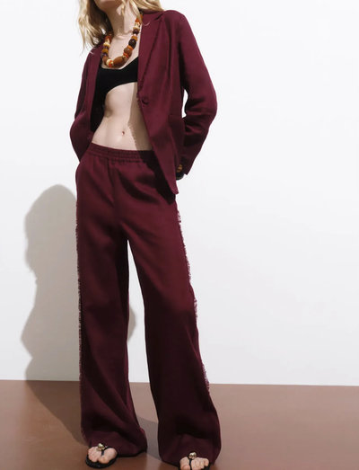 Disse bukser er fremstillet af 100% hør og har en afslappet, lige pasform. Designet har en behagelig elastisk linning, praktiske sidelommer og en moderne, frynset kant. Disse bukser med mellemhøj talje er en del af et komplet sæt og er en alsidig tilføjelse til enhver garderobe.