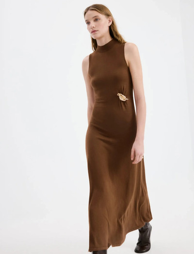 Denne midikjole er fremstillet i en fin strik og har en flatterende A-linje silhuet. Det ærmeløse design er fuldendt med en høj krave og en aftagelig broche i taljen. En alsidig beklædningsgenstand, der ikke kræver lukning.