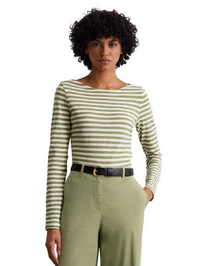 Et klassisk stribet mønster definerer denne langærmede top, hvilket gør den til en alsidig tilføjelse til enhver garderobe. Bådhalsen tilføjer et strejf af elegance, perfekt til lagdeling eller til at bære alene.