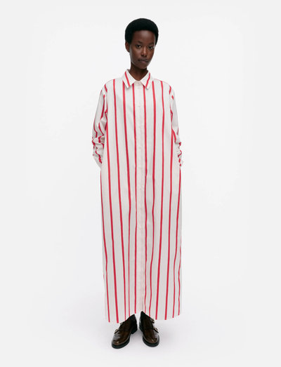 The Muovata shirt dress is made of cotton poplin, and it has a relaxed, straight fit. The dress features the Puhveli pattern, and it has a pointed collar, a button closure, and side seam pockets. The dress has a yoke seam and pleats in the back, and it comes with a narrow separate D-ring belt. The cuffed sleeves have button closures.