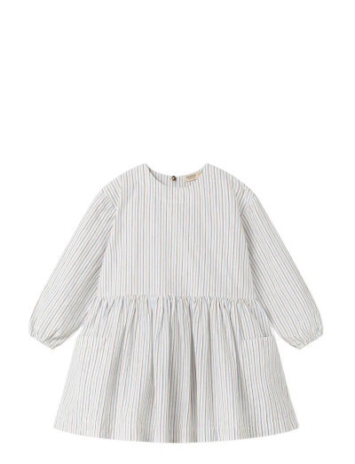 Langærmet kjole med løs pasform. Kjolen har to lommer foran og knaplukning bagpå. Kjolens længde går til over knæet.
