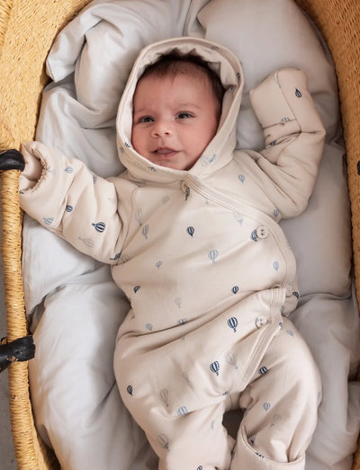 Varm vatteret heldragt med hætte og knaplukning. Heldragten har smart ombuk mulighed på både hænder og fødder for at holde den lille varm