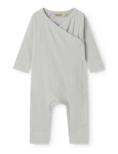 Langærmet heldragt med slå-om-lukning, dragten lukkes med trykknapper fra hals og ned langs det ene ben.