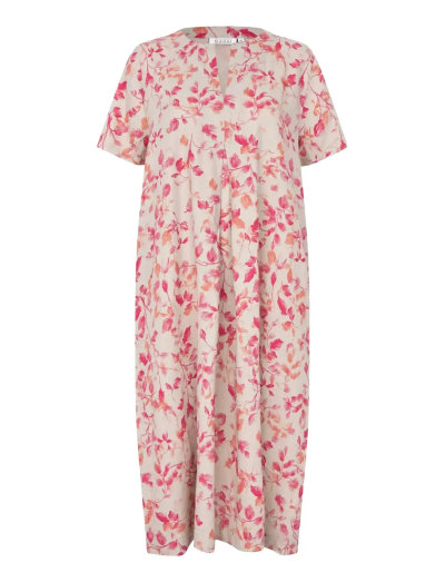 Denne maxikjole har en afslappet silhuet og giver et ubesværet look. Det flydende design fremhæves af en subtil V-hals og korte ærmer, hvilket gør den ideel til varmt vejr.