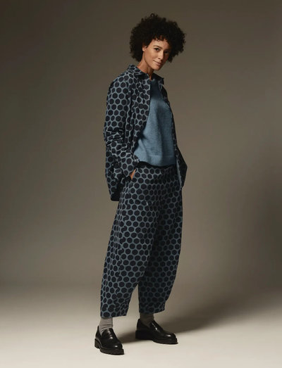 Disse bukser har en beskåret længde og et bredt ben, hvilket giver en moderne silhuet. Det gennemgående mønster tilføjer et legende touch, hvilket gør dem til en alsidig tilføjelse til enhver garderobe. Brug dem sammen med en enkel top for at lade designet skinne.