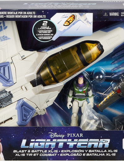 Opdag Disney og Pixars Lightyear. Buzz Lightyear og hans besætning er strandet på en uudforsket planet, og de er nødt til at kæmpe mod fjendtlige planter, gigantiske insekter og den ultimative trussel, Zurg, for at fuldføre deres mission og vende hjem. Fans kan drage på et højhastighedseventyr med dette 50 cm lange Blast & Battle XL-15-rumskib med en Buzz Lightyear -pilotfigur, som tager spændingen fra Lightyear med hjem i stuen. En jetrygsæk med vinger kan sættes på den 12 cm høje Buzz-figurs ryg og skuldre og passer til ham inde i cockpittet. Brug håndtaget under køretøjet til at aktivere et kendt øjeblik fra filmen med den heltemodige space ranger. Vingerne passer til andre Lightyear Buzz XL-piloter i samme størrelsesforhold – hver figur sælges separat og så længe lager haves. Genoplev de nervepirrende filmeventyr med dette rumfartøj, der er fyldt med spændende funktioner og giver saft og kraft til enhver fortælling. Det kommer med knapaktiverede projektilaffyrere på begge sider, 4 projektiler, et cockpit, der kan åbnes, og et landingsstel, der kan foldes ned. Nogle dele kræver en nem engangssamling. Farver og mønstre kan variere.