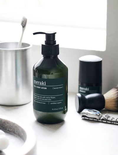 Med face & body lotion fra meraki bliver hudpleje nemt. denne lotion er udviklet særligt til mænd og fungerer plejende og fugtgivende på både den fine hud i ansigtet samt den mere robuste hud på resten af kroppen. kombinationen af en lotion til både ansigt og krop i én gør hudpleje nemt og overskueligt for dig. lotionen indeholder ekstrakt fra kaktusblomst, som vil efterlade et mildt velduftende lag på huden. brug denne face & body lotion bagefter badet eller efter behov.