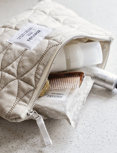 Kom din makeup i Mentha kosmetikpungen fra Meraki. Uanset om du bruger den hjemme til at opbevare din makeup eller bare vil have det mest nødvendige med på weekendturen, er denne pung oplagt. Det quiltede bomuld med dekorative syninger i tidløse og lyse nuancer giver et casual design, som sagtens kan stå fremme på hylden. Et stort rum og mto mindre lommer holder styr på dine makeup børster, neglelak og accessories. Brug den alene eller sammen med en mindre makeup pung, når ferien nærmer sig og du helst ikke vil begrænse dig. Det er der ingen grund til med Mentha.
