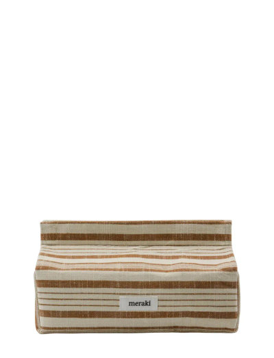 Gør din indretning mere indbydende med denne elegante tissue box i terracotta og beige. Garnfarvede striber og den bløde OEKO-TEX-certificerede bomuld skaber ro og varme, mens dit hjem får et stilfuldt touch. Perfekt til badeværelset, natbordet eller kontoret – holder servietterne tæt på og skjuler dem med diskret luksus. En enkel metode til at skabe hygge og hverdagskomfort i din bolig.