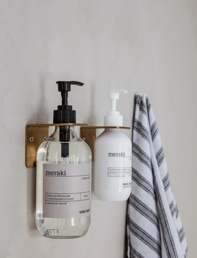 En fin og elegant måde at opbevare Meraki håndsæbe på er med dette fine væghæng fra Meraki. Væghænget hedder Supply, og er naturligvis i 100% rustfrit stål. Efterfølgende er dette belagt med børstet messing, hvilket giver det et rustikt og lækkert udtryk, der vil passe ind i de fleste hjem. Foruden sæbe vil Supply også være oplagt til opbevaring af smykker eller små nips på badeværelset. Supply måler 5,8 cm i længden, 6,7 cm i bredden og 5,8 cm i højden. Passer til vores 275 ml + 490 ml flasker.