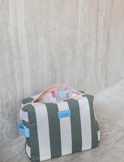 BRING-IT toilettasken fra Mette Ditmer er designet til både hverdagsbrug og rejser. Den er fremstillet i kraftig bomulds-canvas med brede grønne striber på en sandgrå bund. Strop og label i lyseblå giver et grafisk modspil, og den støvet lyserød YKK-lynlås tilfører en legende kontrast. Indvendigt er tasken foret med ensfarvet bomuld i støvet lyserød, der skaber en smuk kontrast til det stribede ydre. Fire lommer holder styr på mindre produkter, og en smuds- og vandafvisende coating beskytter mod fugt og snavs. Den rummelige form giver plads til både små og store toiletsager – også produkter, der skal stå oprejst.